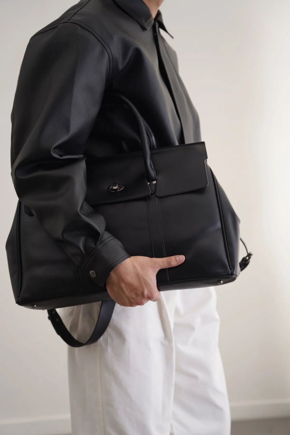 Functional work tote with two inside pockets, both pouch and zipped. It comes with a removable shoulder strap, top closure and twist lock hardware.